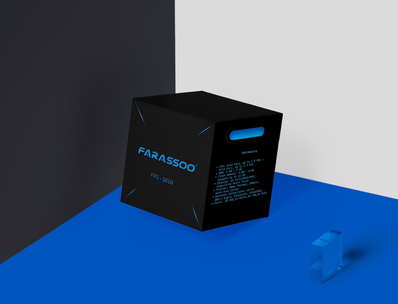 This one is one of many packaging designs I’ve done for Farassoo, which belongs to the POS device. I used blue which was already in Farassoo’s color palette, and added the blue flash lights to the package while completely changing the composition, style, and aspects’ typeface to reach my goal of having a futuristic and modern style.