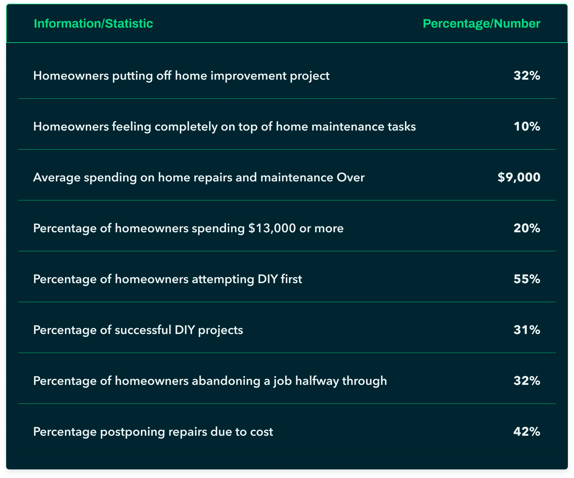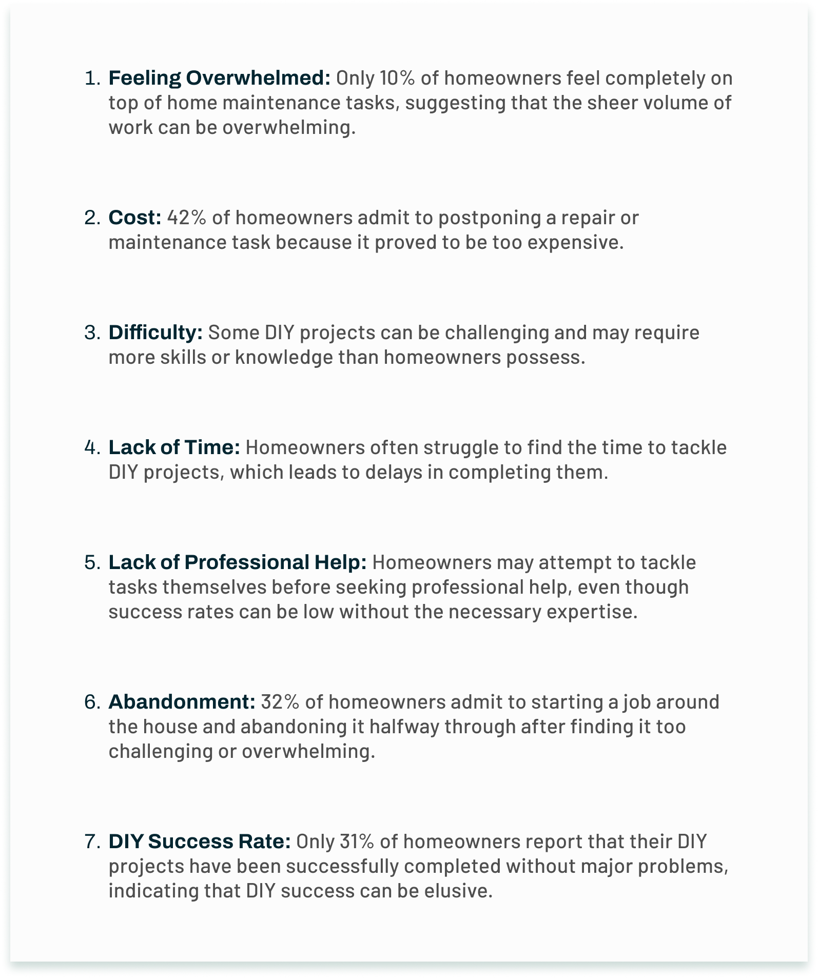 Only 10% of homeowners feel completely on top of home maintenance tasks, suggesting that the sheer volume of work can be overwhelming.